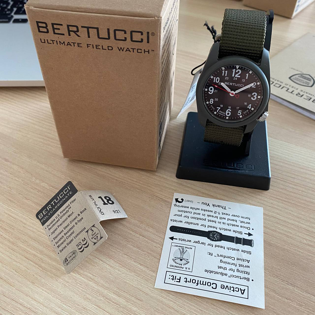 Часы идут в бюджетной, но приятной фирменной коробочке Bertucci, где вы найдете часы на пластиковом стенде и подробные инструкции к часам.