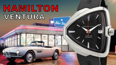 Многие знают эту модель как часы Элвиса Пресли. Первые часы Хамильтон Вентура были выпущены в 1950х годах и на то время это был определенный фурор, так как часы в представлении обычных людей должны были иметь строго круглые формы, а тут вышла модель треугольной формы, к тому же это были первые электрические часы, работающие от батарейки.