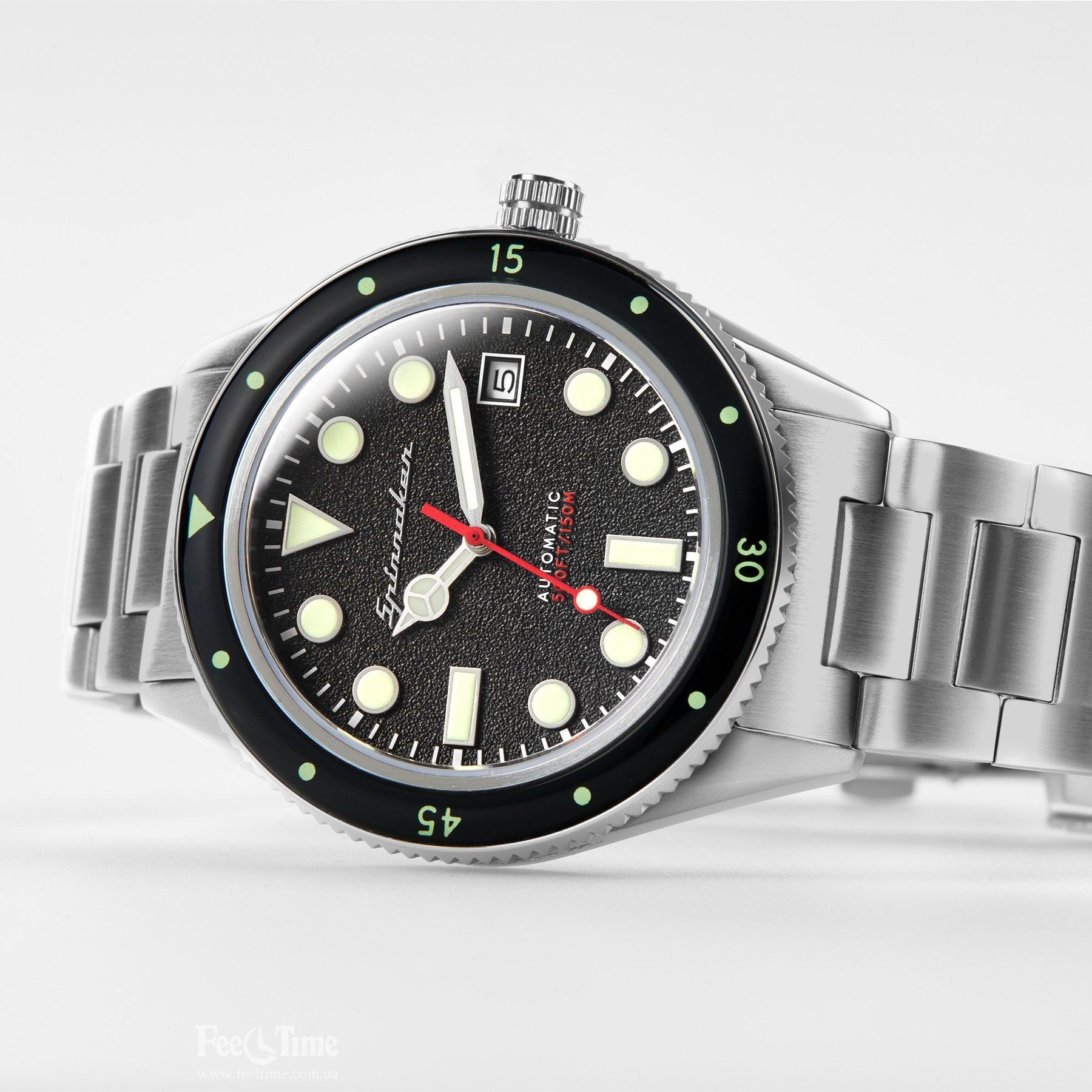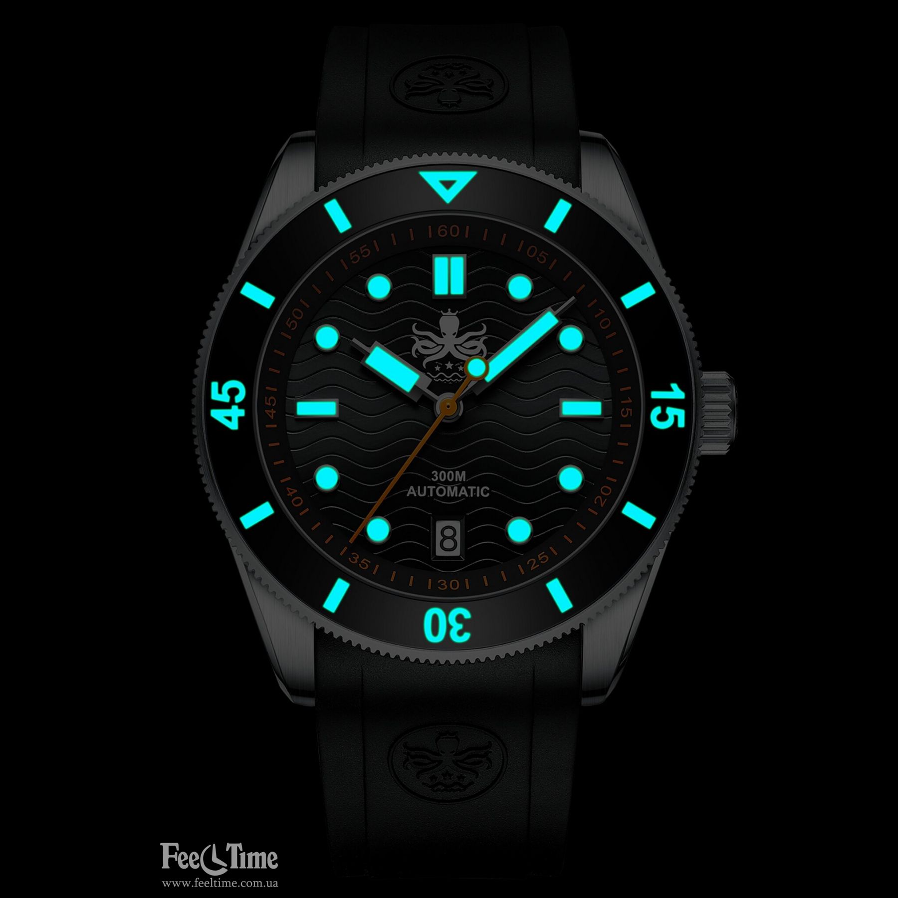 Характеристики здесь отличные. 150 метров водозащита (головка завинчивается для лучшей герметичности), швейцарская Super Luminova на стрелках и метках, сапфировое стекло с антибликом.