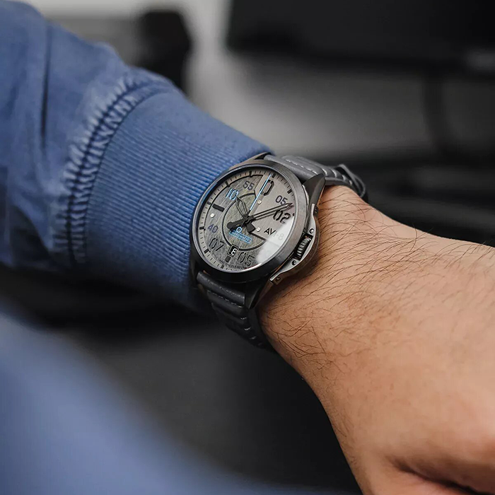 The design of the watch conveys the style of the aircraft. The crown mimics the exhaust of the engine, and the genuine leather strap is inspired by the texture of the seat and neatly stitched with gray thread.