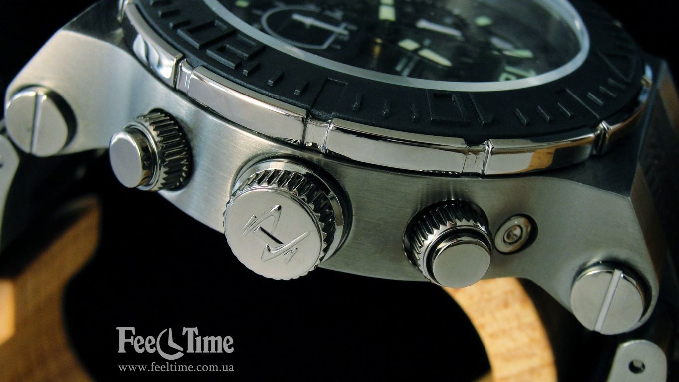 The complete hermeticity of the watch case is ensured by the screw-down pushers of the chronograph and the crown.