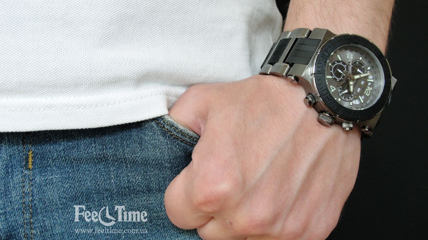 The watch case is moderately large and weighty, and the bracelet is decorated with durable polyurethane inserts in the center.