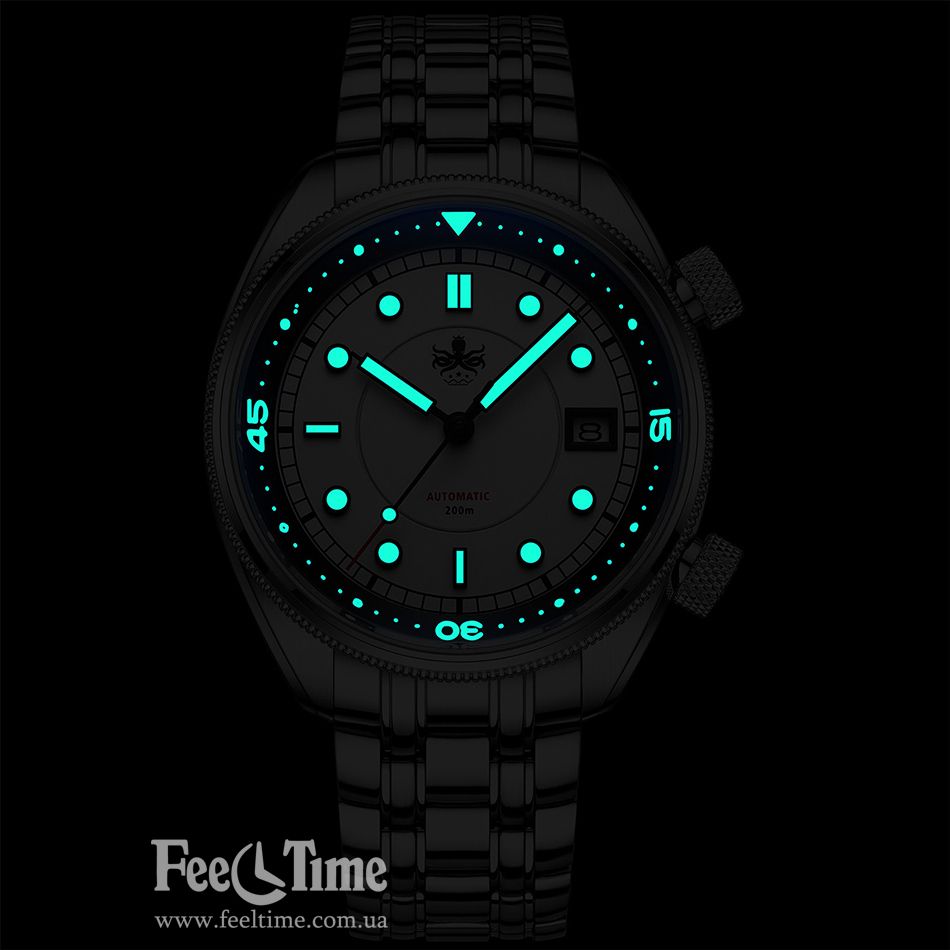 And of course, the dials look very stylish and voluminous. Excellent readability. 15 layers of Swiss Super Luminova shine perfectly in the dark. The dial is covered with sapphire with 3 layers of anti-reflective coating.