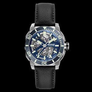 А дизайн здесь достаточно интересный. Футуристические, брутальные формы корпуса из нержавеющей стали 316l. Выделяется скелетонированный циферблат, через который вы можете любоваться японским механизмом Seiko TMI NH72 c запасом хода 41 час, работающим на частоте 21600 полуколебаний в час.