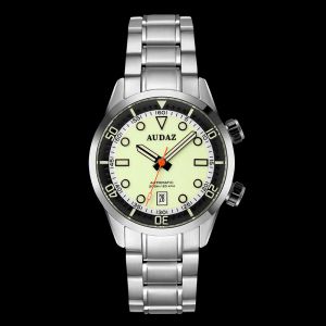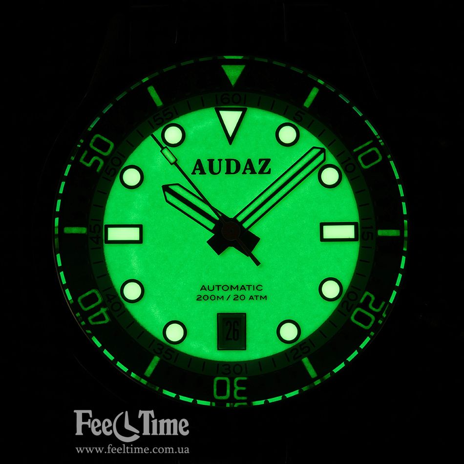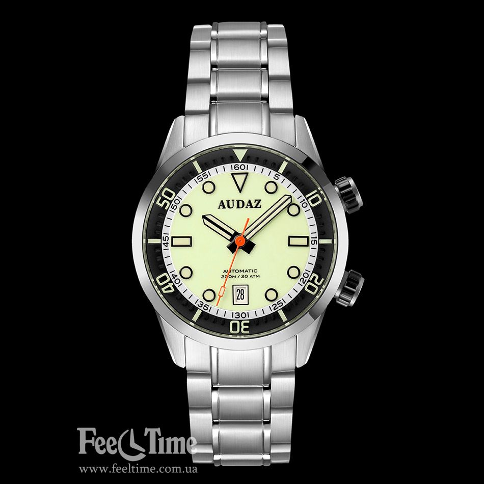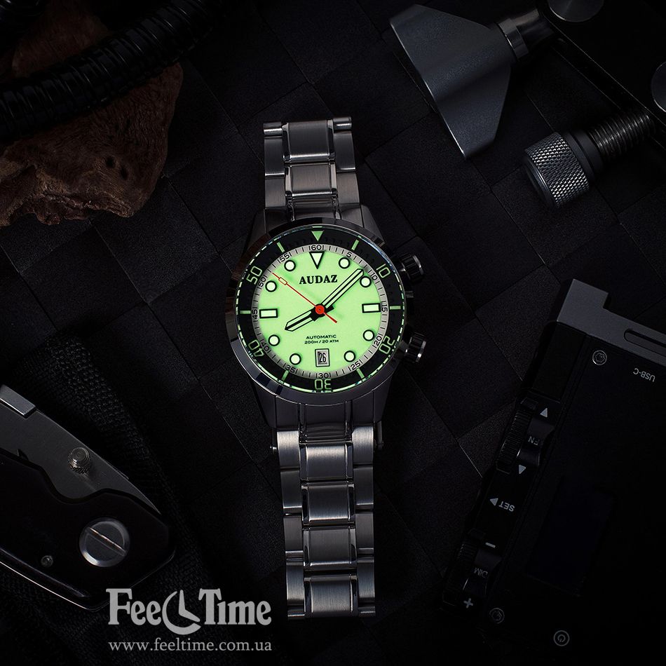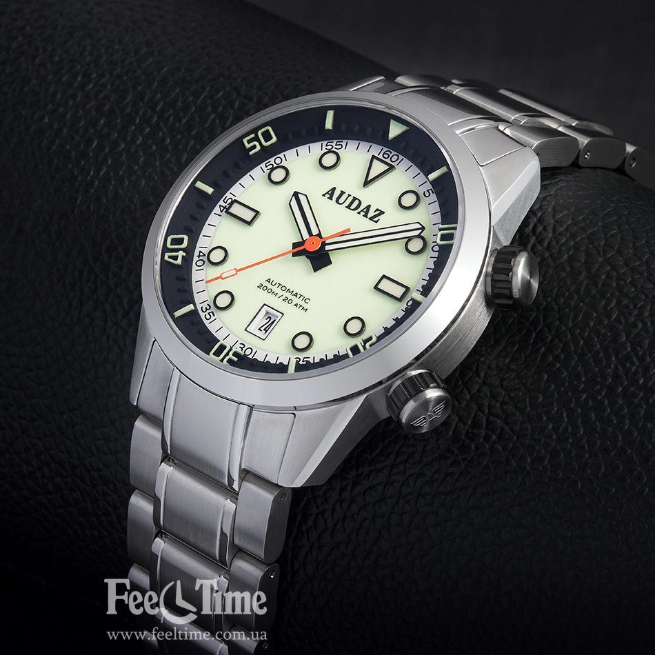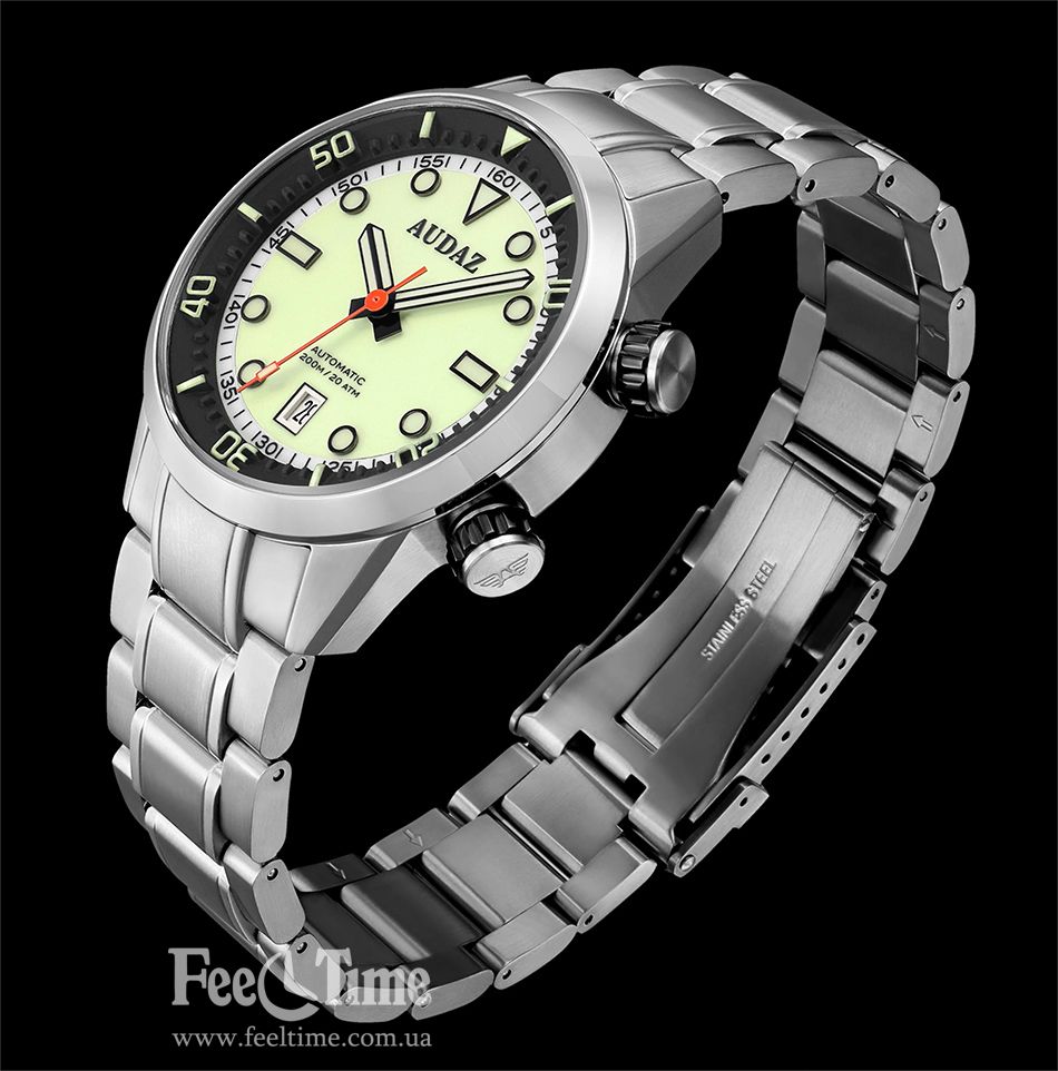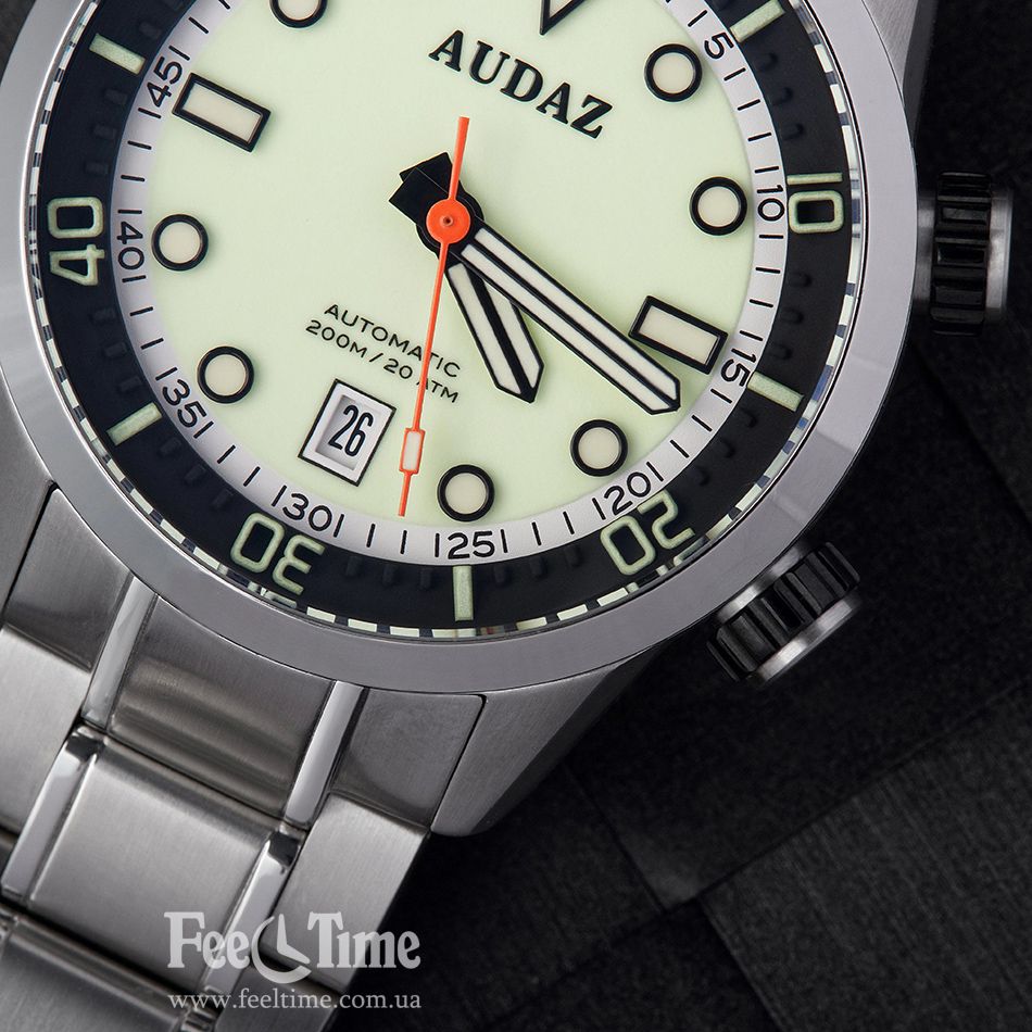 Audaz Seafarer ADZ-3030-05 - это модель, сделанная в лучших традициях стиля "Супер компрессор", когда безель находится внутри циферблата и вращается в две стороны с помощью отдельно выведенной кнопки сверху корпуса.