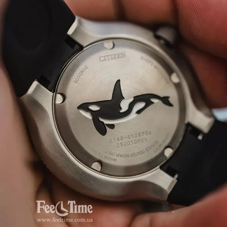 Модель Citizen PROMASTER ECO-DRIVE DIVER "ORCA" BN0230-04E сделана в стилистику Касатки. Сама лицевая часть сделана в цвета этого удивительного существа, плюс гравировка Касатки расположена на задней крышке часов.