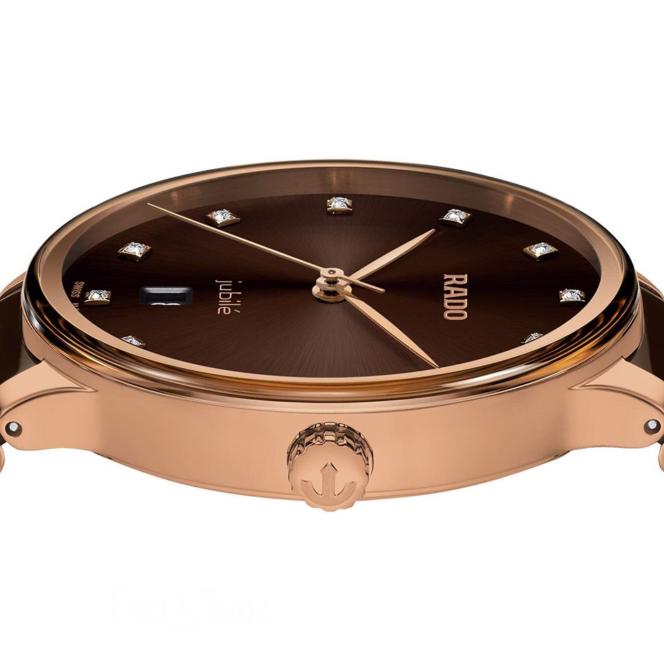 Корпус сделан из нержавеющей стали с PVD покрытием под золото. Браслет в сочетании нержавеющей стали и высокотехнологичной керамики, которая не только прочная, но и очень визуально выделяется, так что Rado с подобным материалом всегда видно даже на расстоянии на руке другого человека.