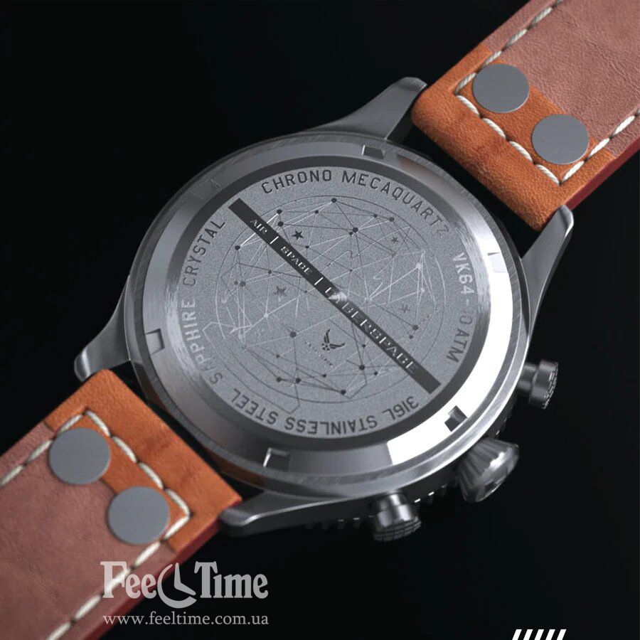 Так же особенностью модели является то, что на борту установлен так называемый, гибридный меко кварц, который работает от батарейки, но визуально идёт как механика (плавный ход секундной стрелки). Это механизм от японского производителя Seiko с калибром VK64.