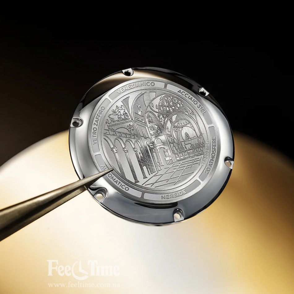Новинка Venezianico Nereide Aureo 39 - 3121590S - не стала исключением. С этой моделью бренд отдат дань уважения золотобойчикам древней Венеции. Венецианико делает акцент на том, что золотая отделка была неотъемлемой частью многих их достопримечательностей. Одну из них - базилику Сан Марко вы можете видеть в качестве гравировки на задней крышке часов.