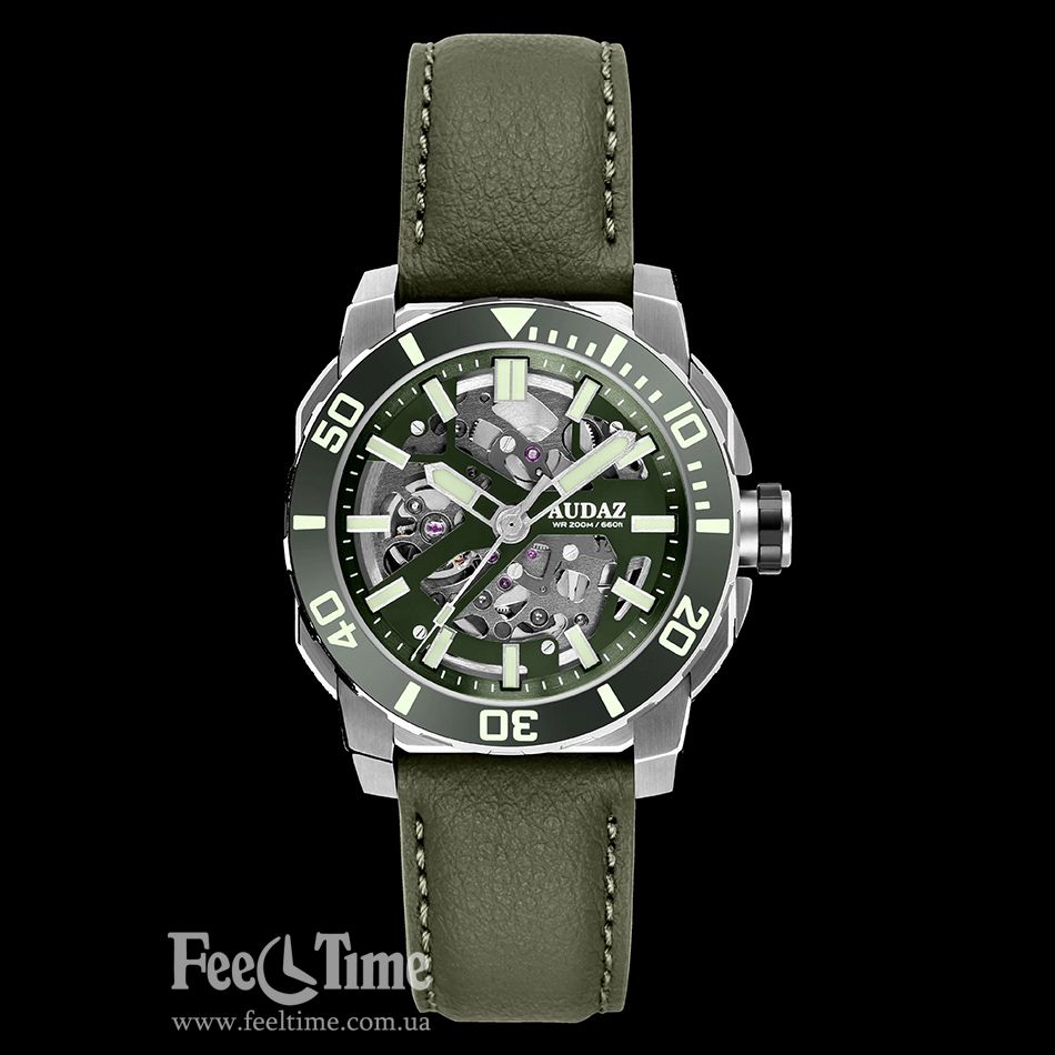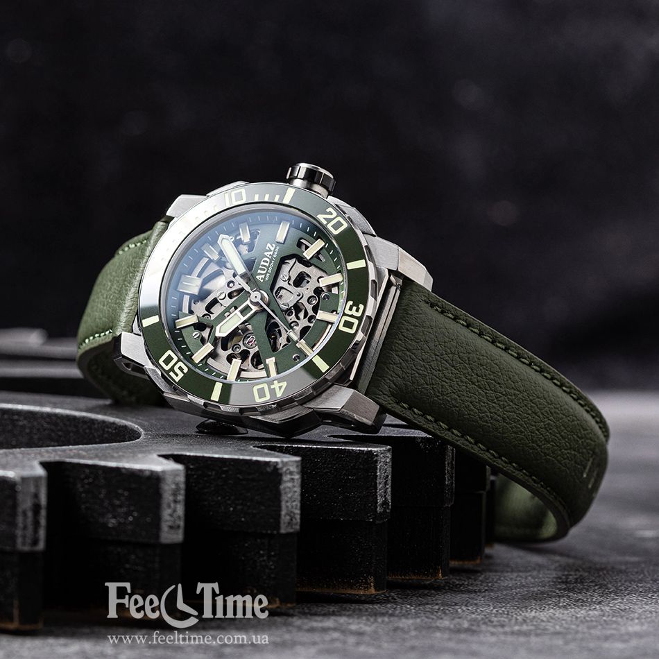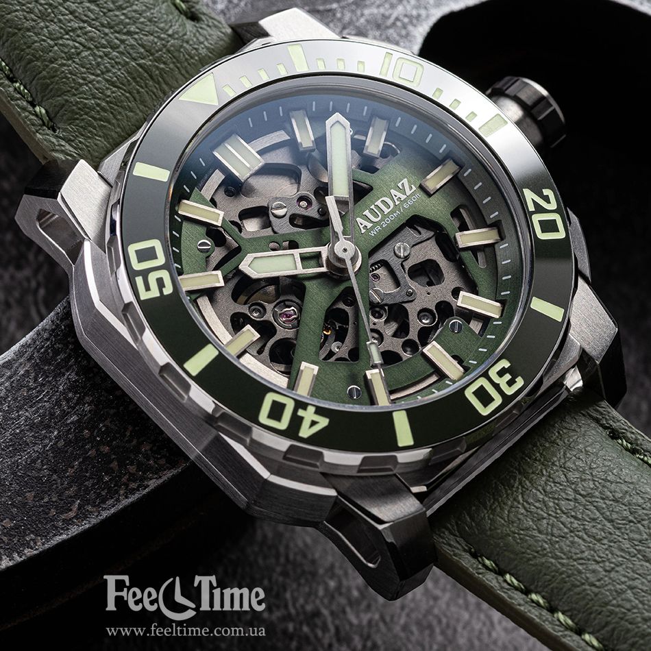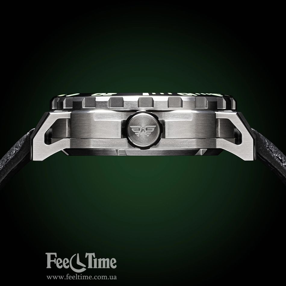 А дизайн тут досить цікавий. Футуристичні, агресивні форми корпусу з нержавіючої сталі 316l. Виділяється скелетонований циферблат, через який ви можете милуватися японським механізмом Seiko TMI NH72 із запасом ходу 41 годину, що працює на частоті 21600 напівколивань на годину.