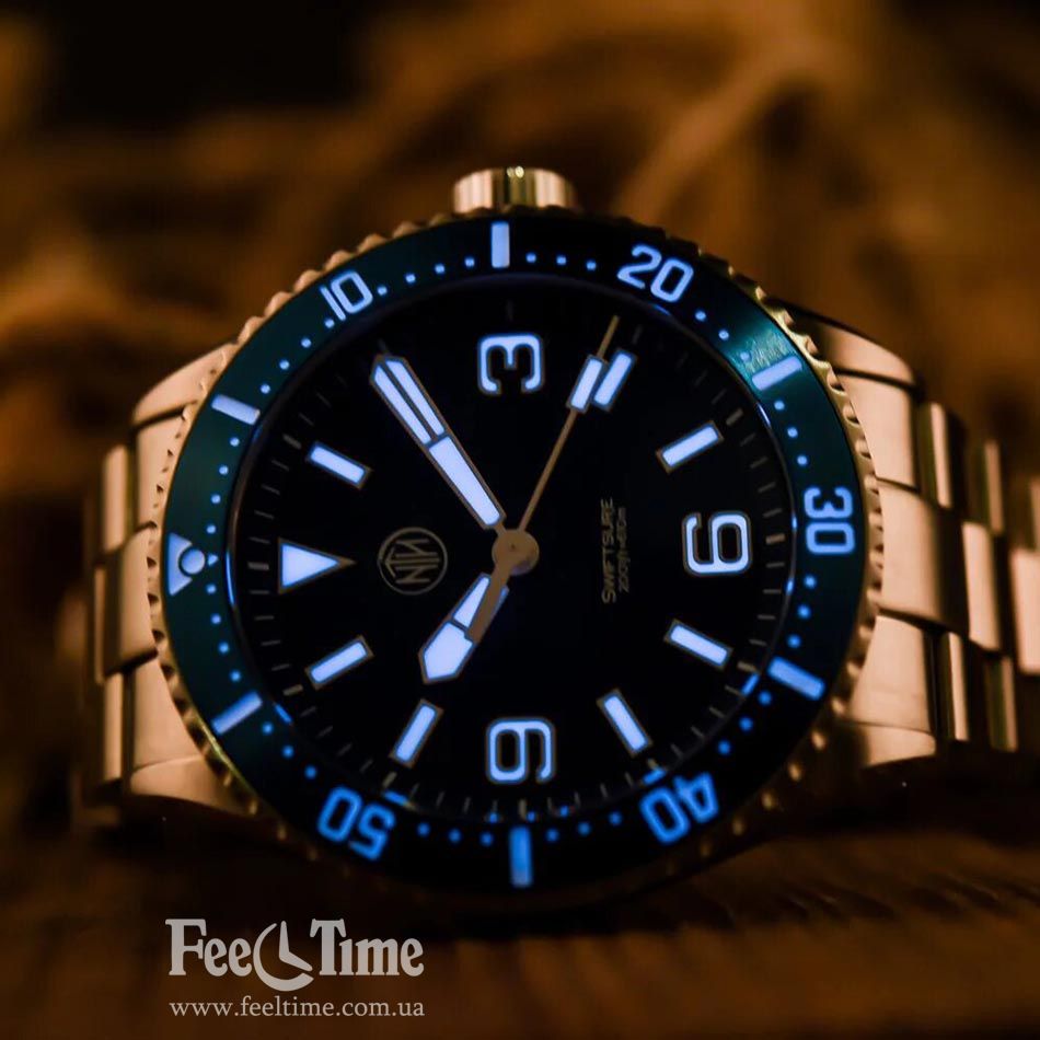 Добре читається циферблат із яскравою швейцарською Super Luminova на стрілках та мітках, щоб час можна було прочитати навіть на глибині.