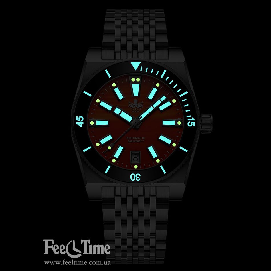 Циферблат годинника чудово читається. До того ж на стрілки та мітки нанесено 15 шарів швейцарської Super Luminova, яка накопичує енергію та яскраво світиться у темряві. Закриває циферблат сапфірове скло з 3-ма шарами антивідблиску.
